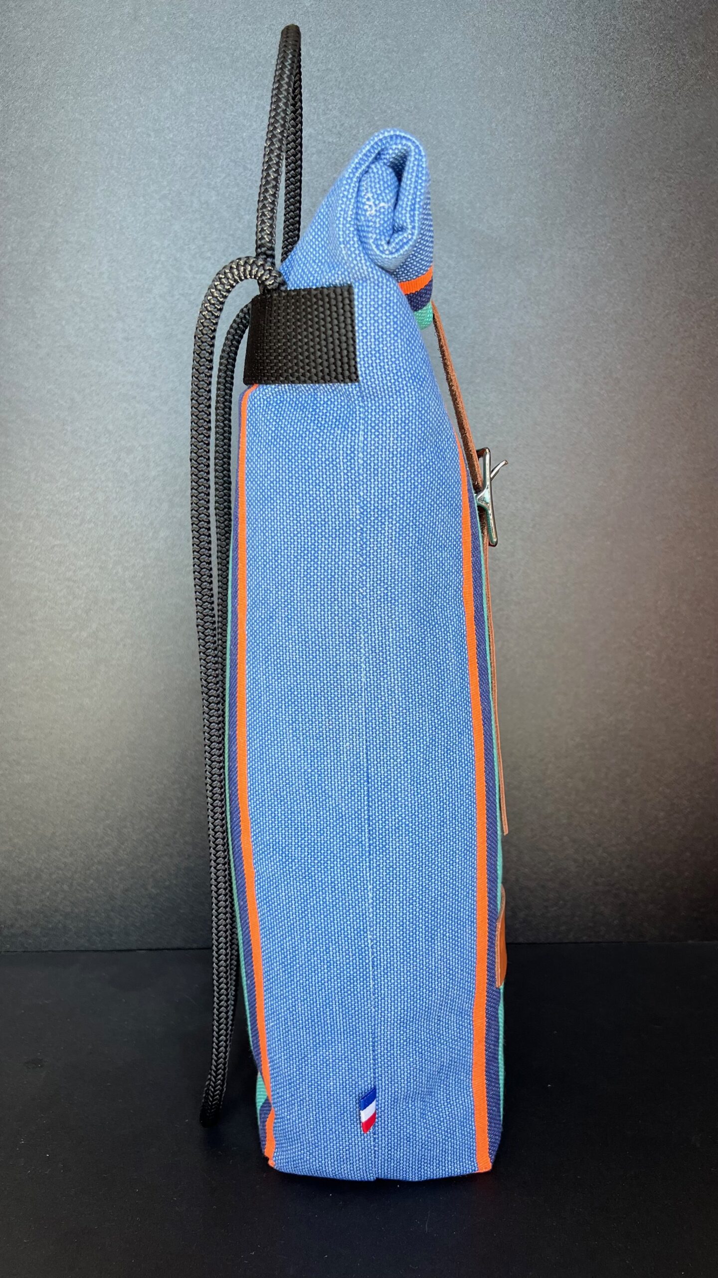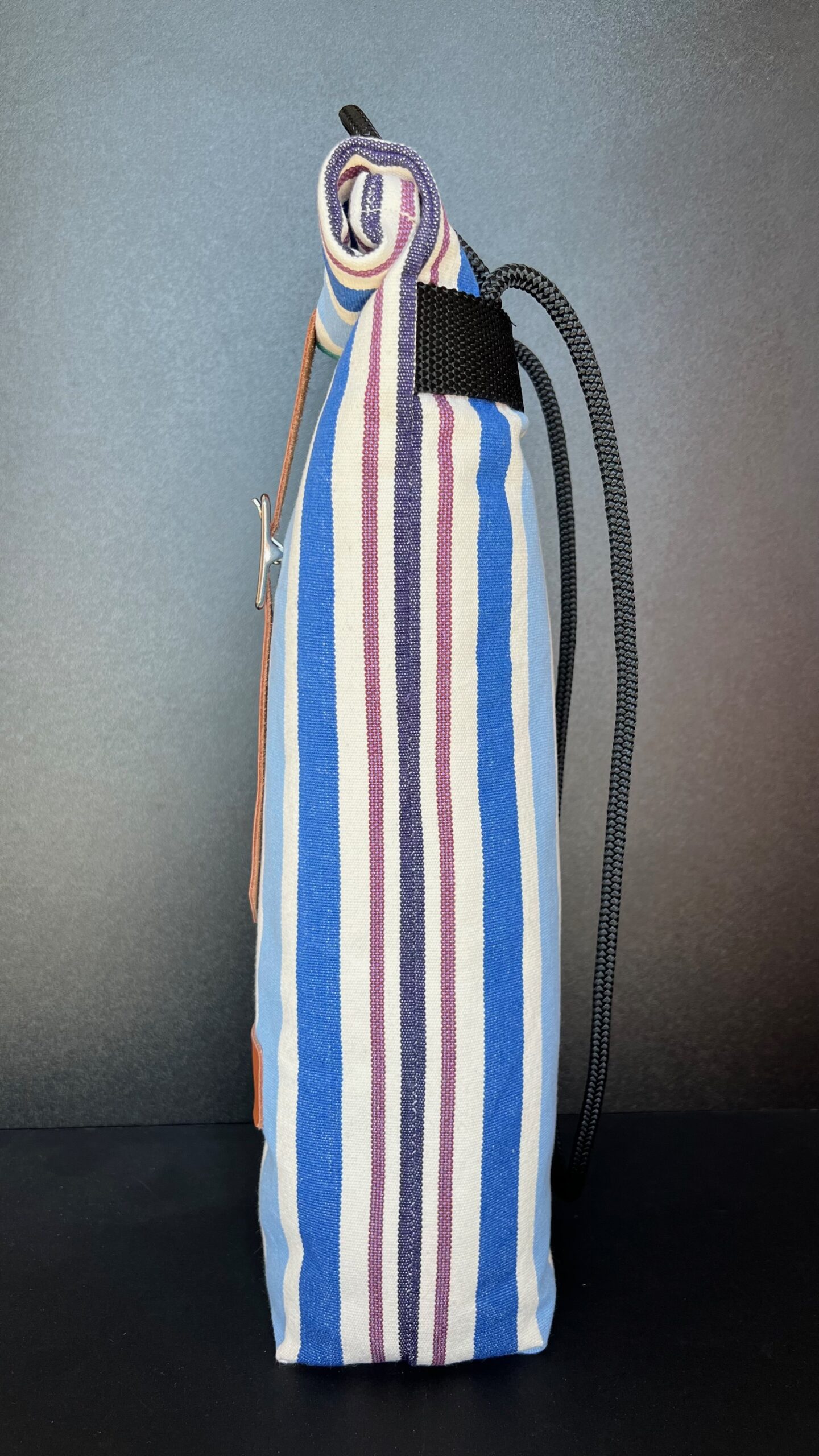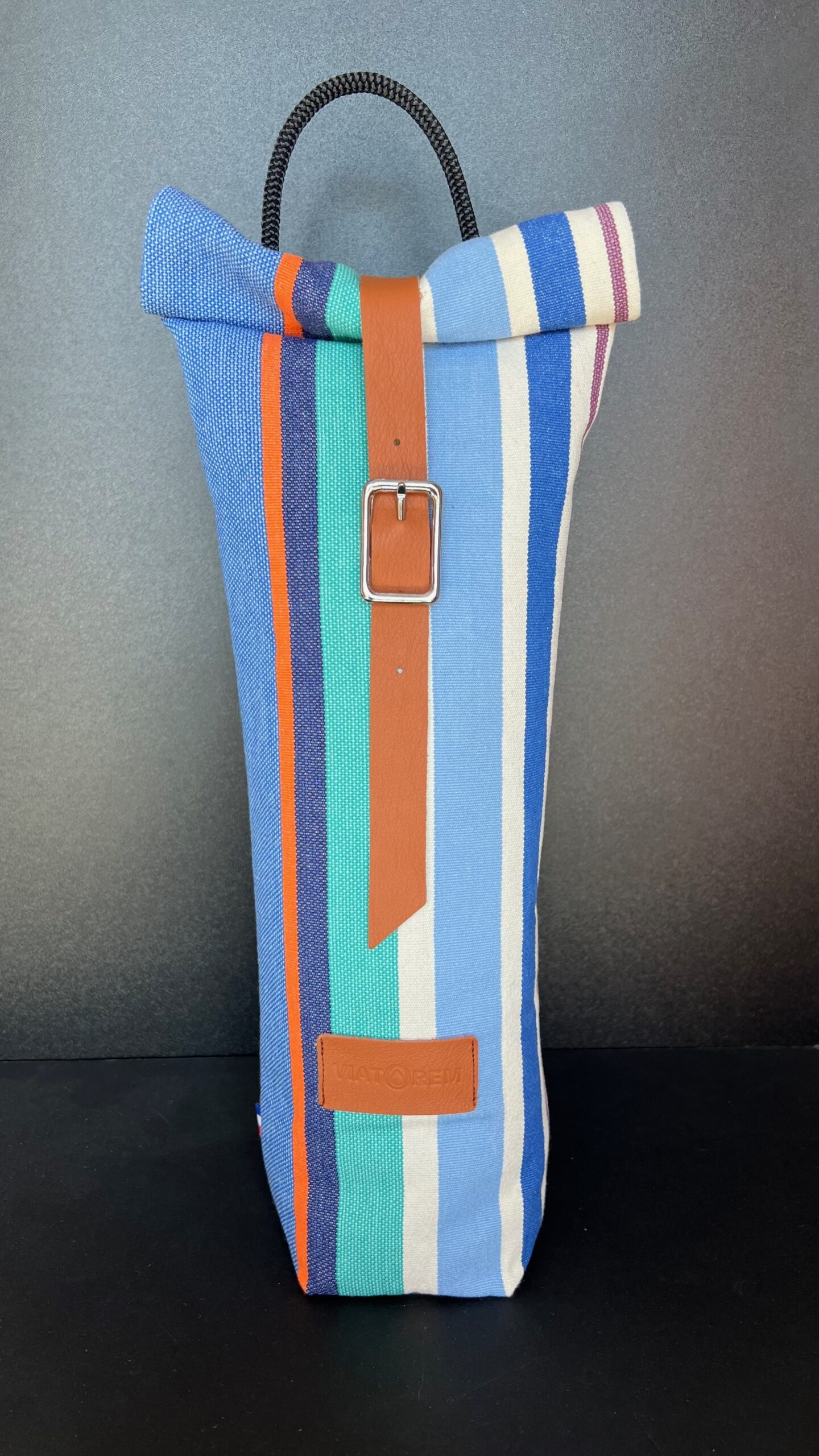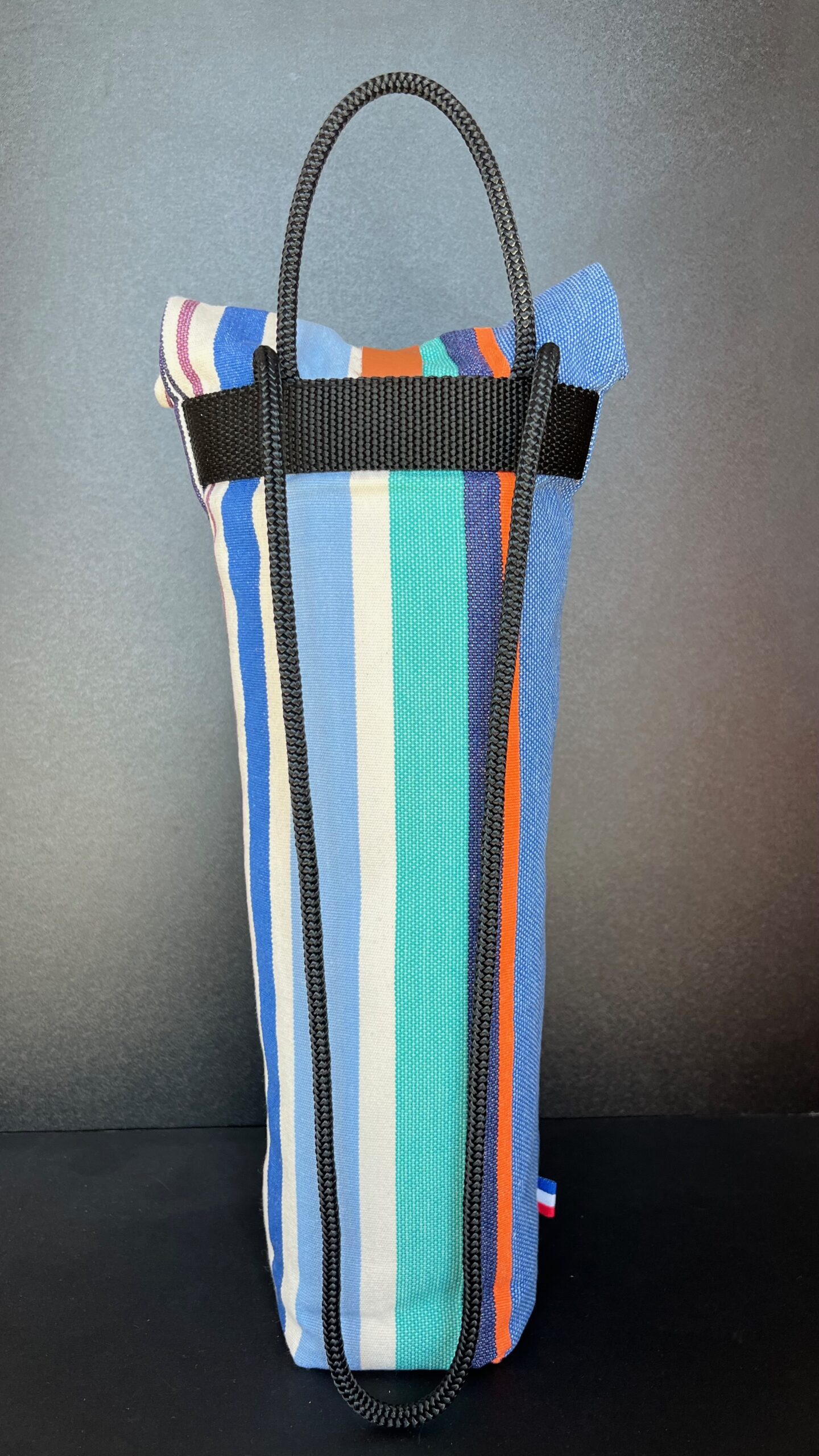 Protège bouteille en tissu, durable antichoc léger et design. Motifs imprimés en couleurs. Système de fermeture par enroulement. Boucle en métal argenté et sangle en cuir. Double corde de portage pour le porter à la main ou à l’épaule.